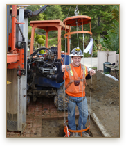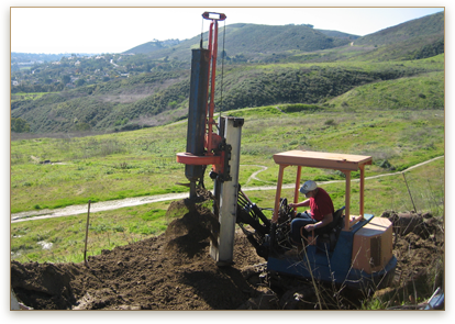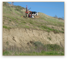 Our limited-access, track-mounted drill rig can get to those steep, narrow access spots that conventional truck-mounted rigs can't. We can drill quickly to 45' before needing to use stemming to reach greater depths. Equipped with a 24" diameter flight auger and a coring bucket, we can get through the common Southern California bedrock formations, even when concretions are encountered. Our rig is equipped with a 140-pound downhole hammer for sampling and we have equipment for safe downhole logging. Upon completion of exploration, we are equipped to backfill the borings.